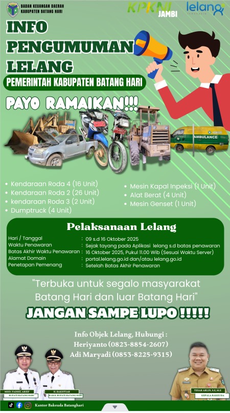 Baca Jambi – Pemerintah Kabupaten Batang Hari melalui Badan Keuangan Daerah (Bakeuda) mengumumkan pelaksanaan lelang barang milik daerah yang akan berlangsung mulai 9 hingga 16 Oktober 2025.