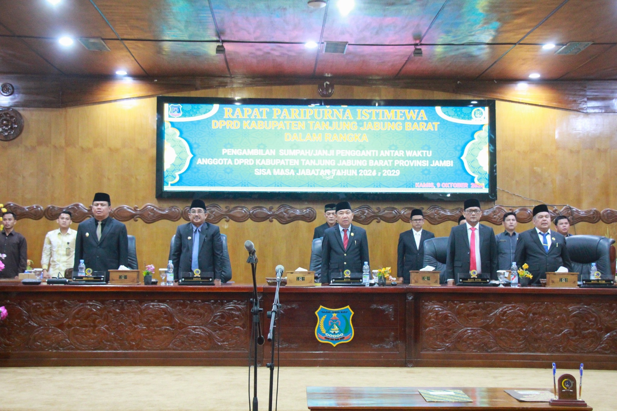 Tanjab Barat – Bupati Tanjung Jabung Barat, Drs. H. Anwar Sadat, M.Ag., didampingi Wakil Bupati Dr. H. Katamso S.A, S.E., M.E., menghadiri Rapat Paripurna Istimewa DPRD Kabupaten Tanjung Jabung Barat dalam rangka Pengambilan Sumpah dan Pergantian Antar Waktu (PAW) Anggota DPRD masa jabatan 2024–2029. Acara berlangsung di Ruang Rapat Paripurna DPRD Tanjab Barat, Kamis (9/10).