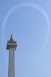 Dari udara, pesawat pembawa Nusantara Flag melintas gagah, diikuti formasi pesawat militer yang membentuk angka “80” di langit biru. Sorak-sorai masyarakat yang memadati area Monas menambah semarak suasana, menciptakan momen kebanggaan nasional yang tak terlupakan.