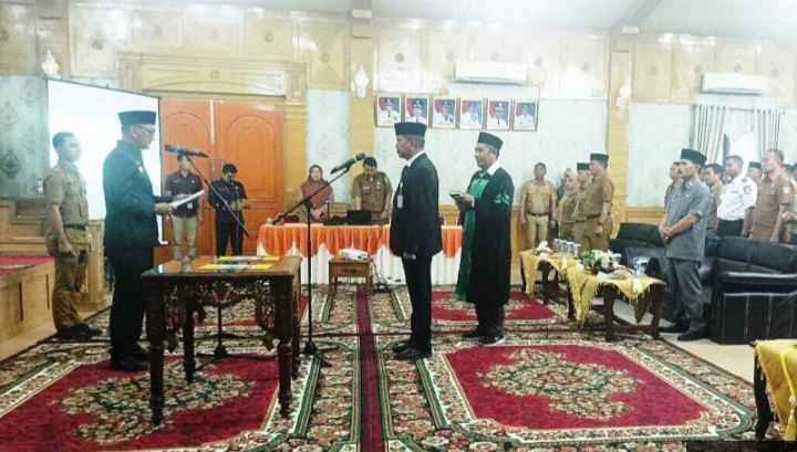 Prosesi pelantikan dibarengi dengan pengambilan sumpah/janji Pj Sekda kali ini berlangsung pada Selasa (29/07) di ruang pola utama Pemkab Sarolangun.