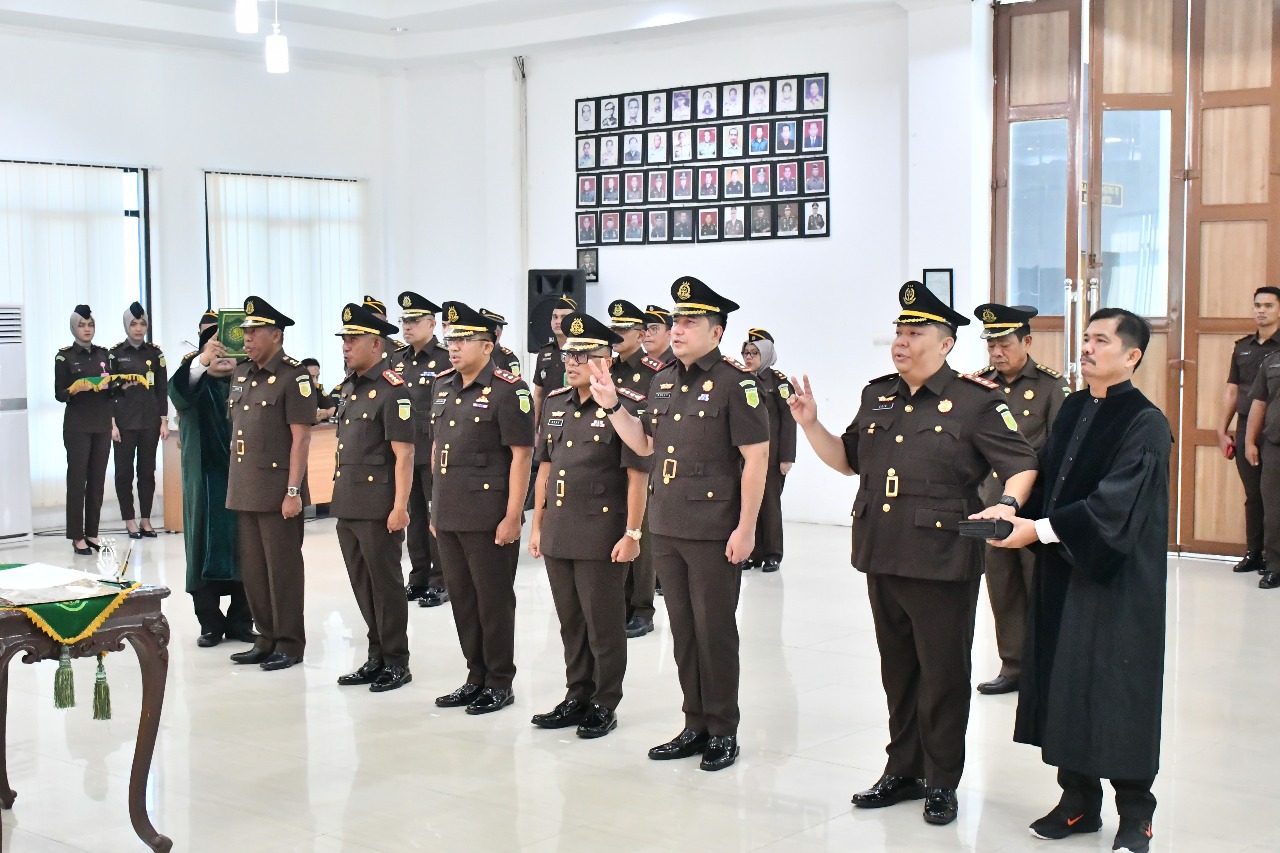 Jambi – Dalam rangka meningkatkan kinerja dan penyegaran dalam organisasi, Kepala Kejaksaan Tinggi (Kajati) Jambi Dr. Hermon Dekristo,SH.,MH mengambil sumpah dan melantik 6 (enam) Pejabat Eselon III dilingkungan Kejaksaan Tinggi Jambi, Senin (28/07/2025) bertempat di Aula Jaksa Agung R. Soeprapto Kejati Jambi.