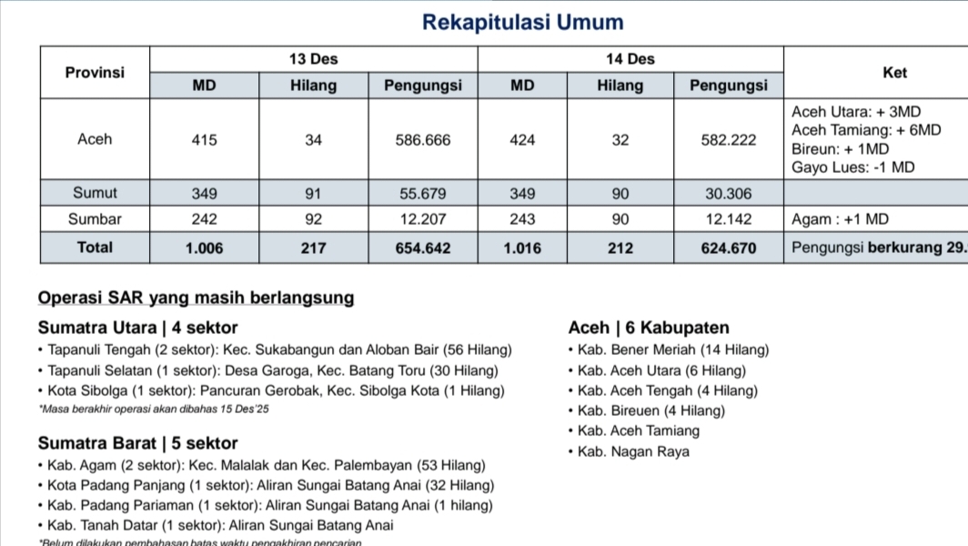 Dalam seminggu terakhir dari tanggal 8- 13 Desember 2025 korban meninggal dunia bertambah 66 jiwa, dengan rincian Provinsi Aceh 33 jiwa, Sumatra Utara 19 jiwa dan Sumatra Barat 14 jiwa.