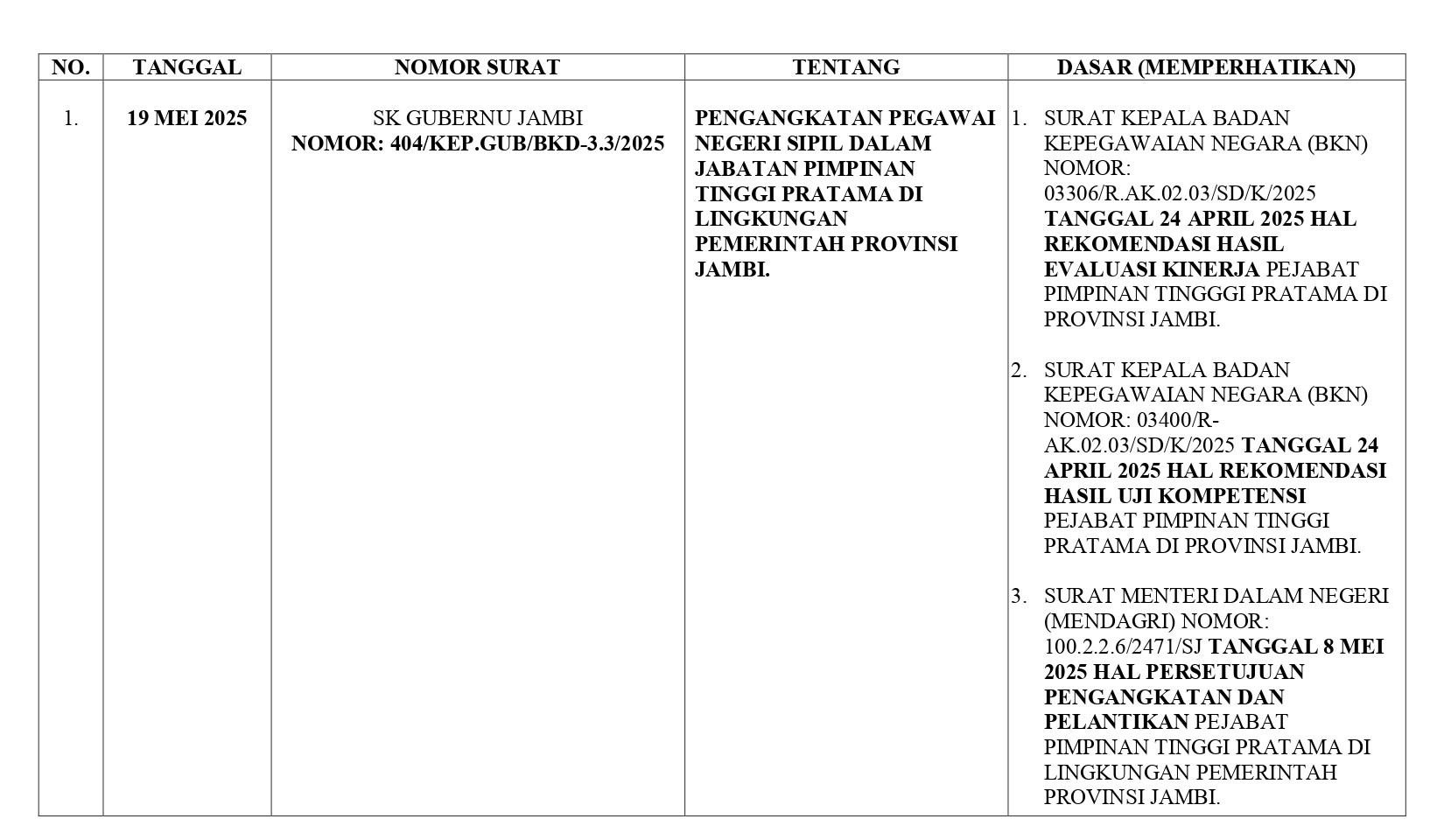 Pada SK pertama bernomor 404/KEP.GUB/BKD-3.3/2025 tentang Pengangkatan Pegawai Negeri Sipil (PNS) dalam Jabatan Pimpinan Tinggi Pratama di Lingkungan Pemprov Jambi, tertanggal19 Mei 2025.