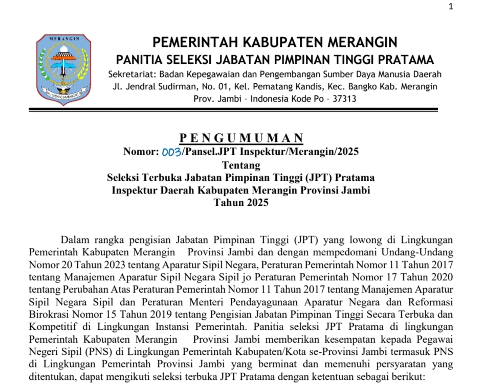 Merangin – Panitia Seleksi (Pansel) Jabatan Pimpinan Tinggi (JPT) Pratama mengumumkan secara resmi seleksi jabatan Inspektur Daerah Kabupaten Merangin, Provinsi Jambi Tahun 2025.