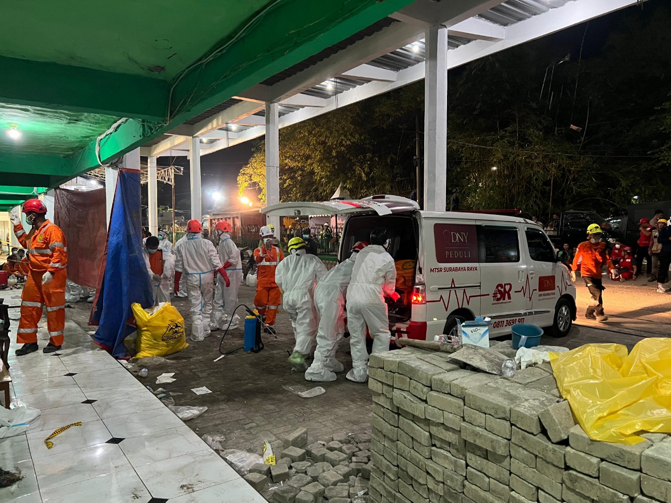 Badan Nasional Penanggulangan Bencana (BNPB) bersama Badan Penanggulangan Bencana Daerah (BPBD) per hari ini telah mendirikan tenda pengungsi di RS Bhayangkara, Surabaya, demi memfasilitasi segala keperluan keluarga korban.