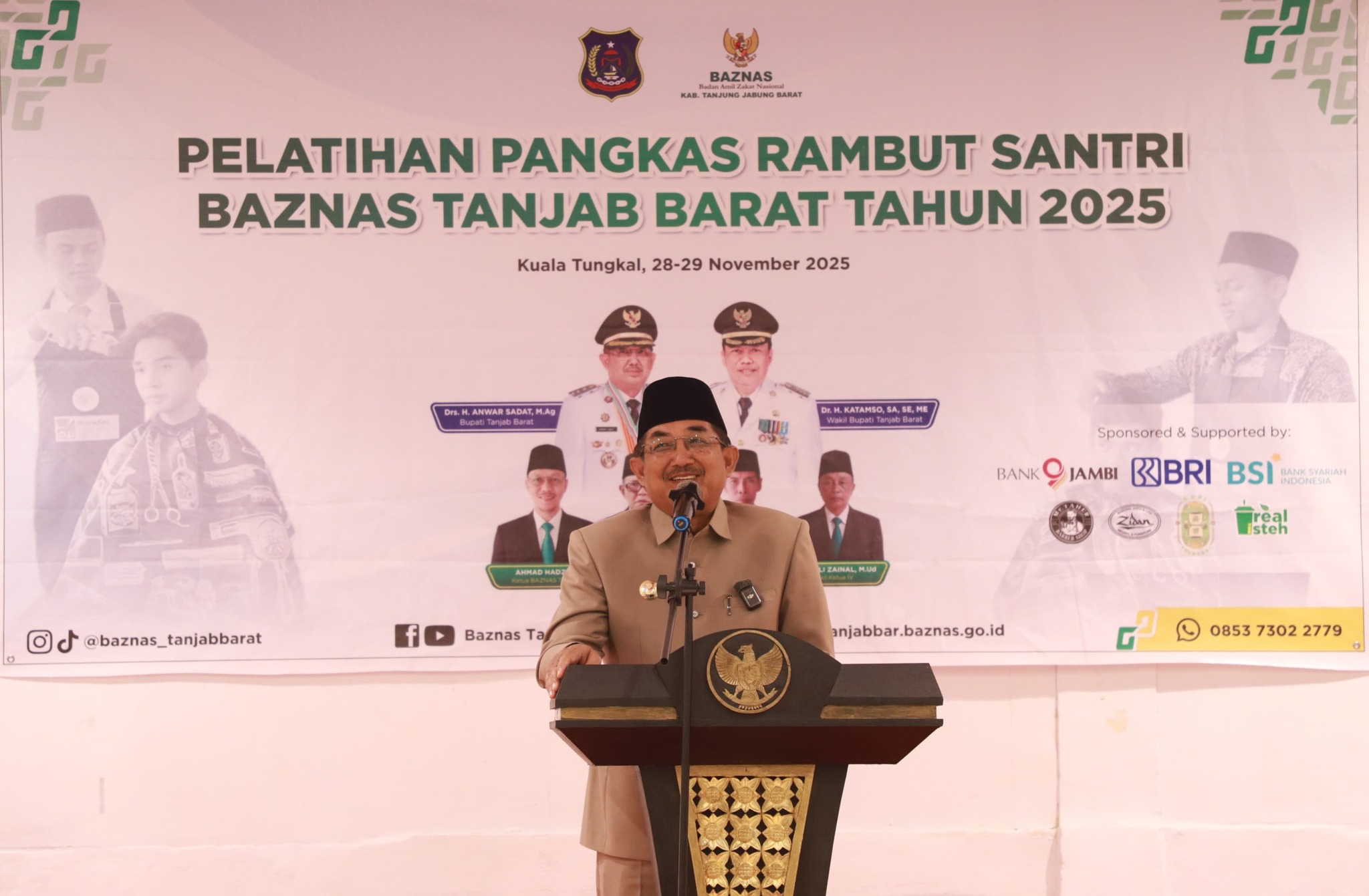Kuala Tungkal – Bupati Tanjung Jabung Barat Drs. H. Anwar Sadat, M. Ag meresmikan Pelatihan Pangkas Rambut Santri yang digelar Badan Amil Zakat Nasional (Baznas) Kabupaten Tanjung Jabung Barat di Hotel Rivoli Kuala Tungkal, Jum’at (28/11). Kegiatan yang berlangsung selama dua hari, 28–29 November 2025 ini menjadi bagian dari penguatan program zakat produktif untuk membekali santri dengan keterampilan usaha dan mendukung kemandirian ekonomi pesantren.